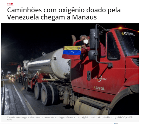 A Venezuela já doou e entregou, com sua frota, mais de 130 mil metros cúbicos de oxigênio ao Brasil, apesar de o governo Maduro não ser reconhecido pelo governo de Jair Bolsonaro (ex-PSL), que apoia o boicote dos Estados Unidos imposto pelo país.