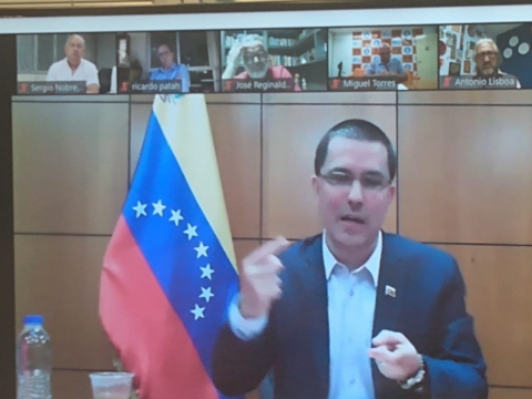 Ministro das Relações Exteriores, Jorge Arreaza, em reunião virtual com as centrais.
