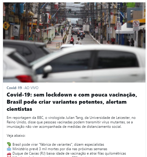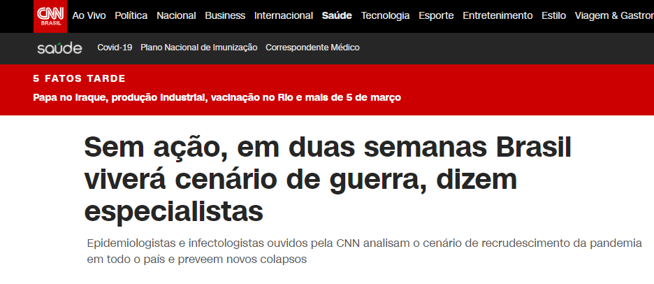 Desculpem. Seria Cômico, não fosse trágico. Todos os especialistas no mundo estão dizendo e na maioria dos países do mundo o Lockdown esta sendo implementado, apesar de já haver muita gente vacinada por lá. Por aqui, nem vacina e nem lockdown. Pelo contrário, Bolsonaro e seus seguidores pedem abertura da economia, sem vacinação do povo. Jogam milhares a morte. Uns por convicção e outros muitos por só terem a alternativa de enfrentar a morte pelo vírus ou pela fome.
