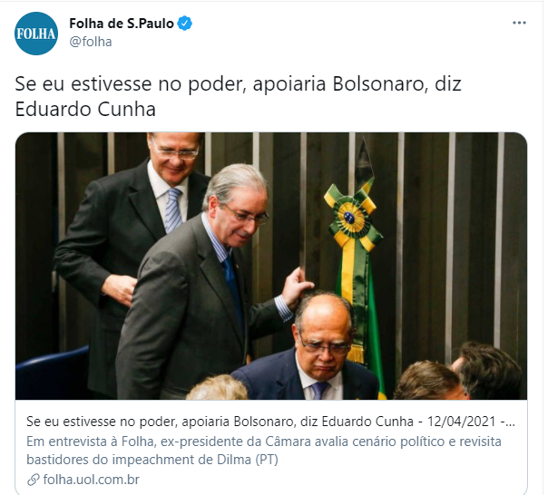 Ontem publiquei aqui no Blog o artigo Empresários do RS apoiam Bolsonaro mesmo com economia despencando e desemprego crescendo, diz a mídia. Hoje a Folha publica que Eduardo Cunha, condenado por corrupção e contratado por empresários lacaios para forjar o golpe contra Dilma enquanto era Deputado, também apoia Bolsonaro pela mesma razão.
