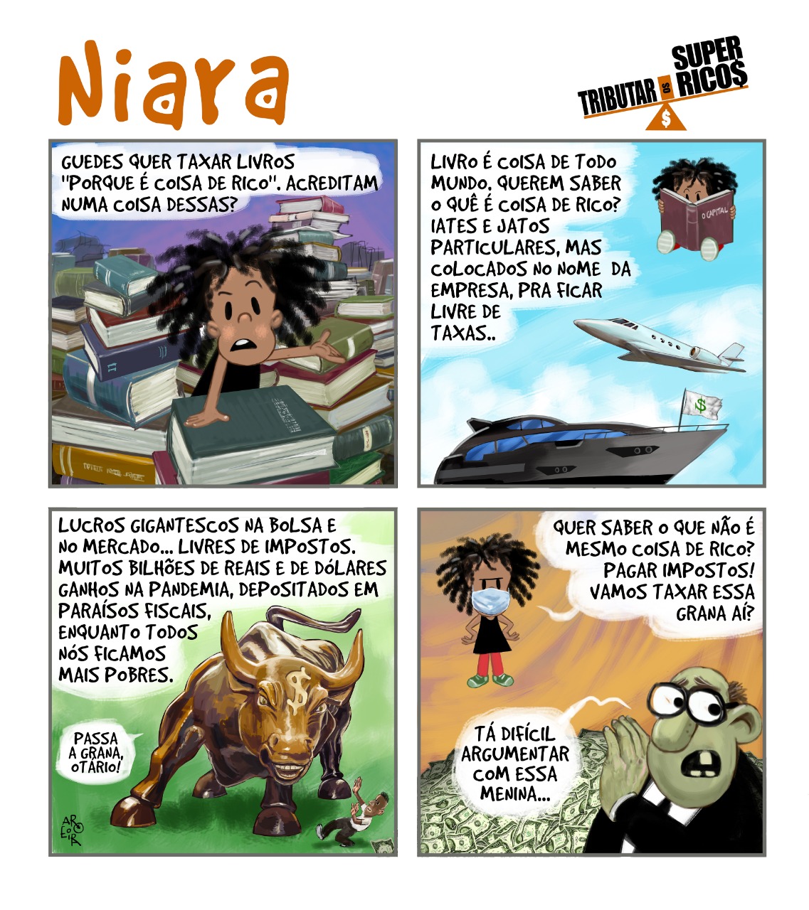 Niara é esta guria esperta que o Aroeira criou para a Campanha Tributar os Super Ricos do Brasil. Por que no resto do mundo eles são tributados e o percentual não é baixo não.