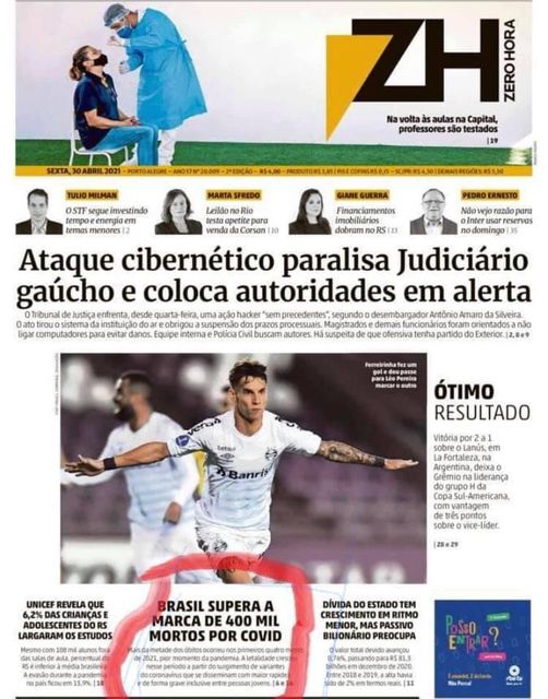 A CPI da Pandemia ou CPI do Genocídio já abriu os trabalhos, mas o guardião das barrancas do dilúvio trata 400 mil mortes no Brasil como algo secundário. Até coloca na capa, mas ali em baixo, bem escondidinho.