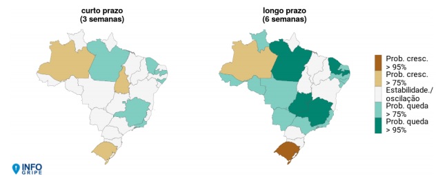 Quando analisado o cenário das capitais, a Fiocruz estima que Porto Alegre, Manaus e Palmas têm mais de 75% de probabilidade de crescimento de casos e óbitos nas próximas três semanas. Já na tendência de longo prazo (seis semanas), Porto Alegre aparece com 95% de probabilidade de crescimento, enquanto Manaus é a única outra capital com a mesma tendência, mas com 75% de probabilidade.