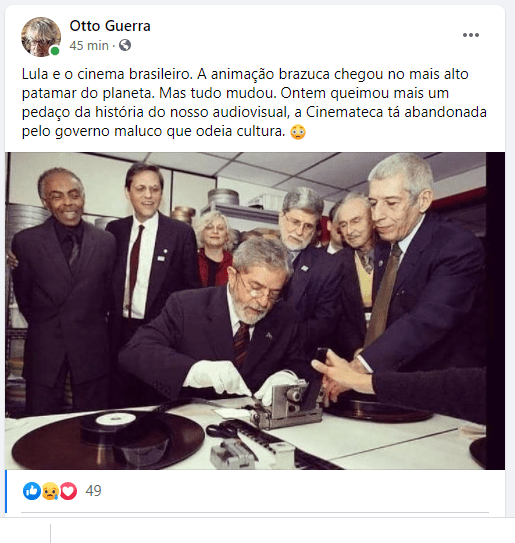 Queimar a CINEMATECA é só parte do Projeto de Destruição da memória e da produção Cinematográfica nacional que esta sendo conduzido desde o Golpe de 2016. Com apoio de Lula, ” a animação brazuca chegou no mais alto patamar do planeta”, diz o Cineasta Otto Guerra, hoje membro da Academia de Cinema de Hollywood.
