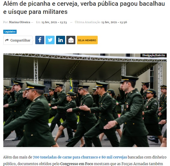Além das mais de 700 toneladas de carne para churrasco e 80 mil cervejas bancadas com dinheiro público, documentos obtidos pelo Congresso em Foco mostram que as Forças Armadas também compraram mais de nove mil quilos de filé de bacalhau, 139 mil quilos de lombo do mesmo peixe, além de dez garrafas de uísques 12 anos para o Comando do Exército e de 660 de conhaque para o Comando da Marinha.