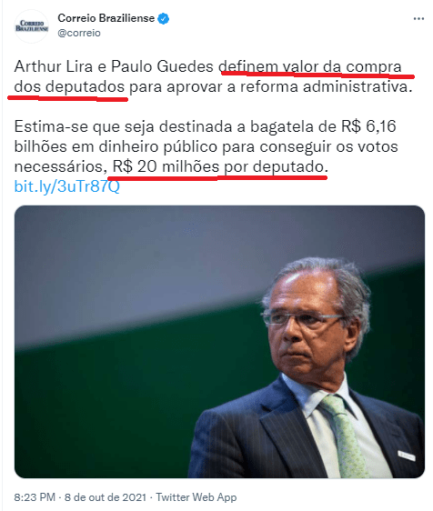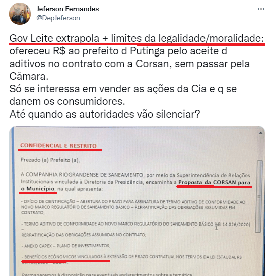 A Compra de Políticos esta tão comum, que nem a mídia nacional e nem Governos escondem mais e estampam o suborno ou a tentativa dele em documentos e até em manchetes. No Correio Braziliense, a Manchete “Lira e Guedes definem valor da Compra de Deputados…”, e no RS Eduardo Leite apresenta o que parece ser uma proposta para compra de Prefeitos no tema da Regionalização, preparatória a PRIVATIZAÇÃO da CORSAN. A denúncia a partir de documento “confidencial” do Governo do Estado, foi feita pelo Deputado Jeferson Fernandes nas Redes Sociais.