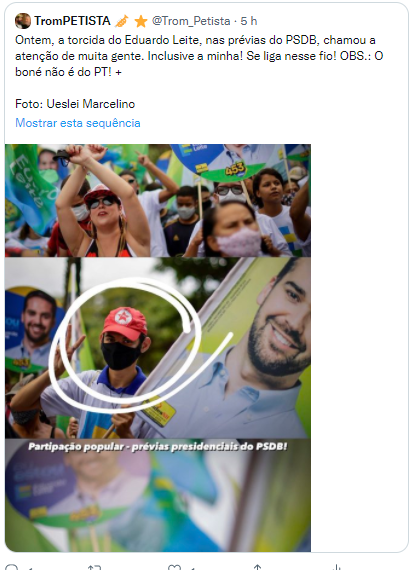 Foram R$ 2 milhões por um aplicativo que não funcionou. Teve também uma estranha “participação popular” na prévia do PSDB. Mas os cabos eleitorais do Eduardo Leite não tem só o fato de terem sido provavelmente contratados com dinheiro do Fundo Partidário ou sabe-se lá que outro recurso público. Apareceu ali gente com boné de um Movimento que fez campanha pelo impechment da Dilma, mas dizia que não haveria o golpe. Pois é. Será que desta vez foram só os bonés na cabeça de gente paga? Segue o texto dos Tuites do conhecido @trom_petista, que identificou esta “curiosidade” vermelha do movimento LEITONARO gaúcho para a Prévia contra o BOLSODÓRIA paulista.