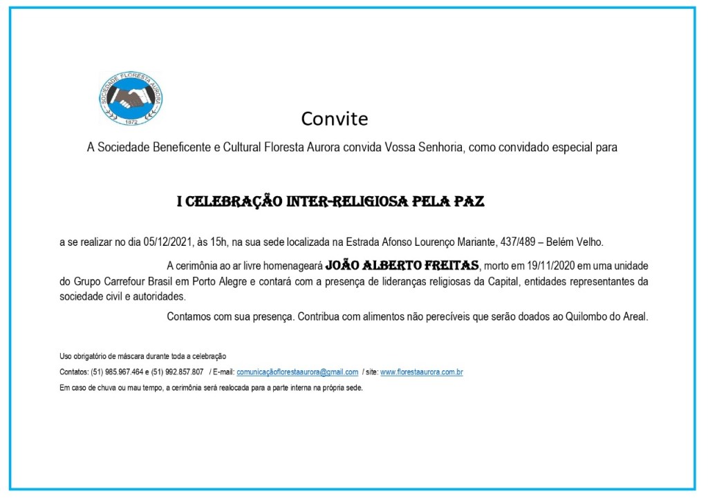 No dia 05 de dezembro, acontece na sede da entidade, o evento Celebração pela Paz, em homenagem a 1 ano do falecimento Beto Freitas, uma celebração religiosa envolvendo representantes das diversas religiões, além da participação de representantes e agentes do movimento negro e da luta de combate ao racismo, e atrações culturais.