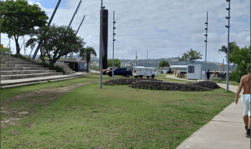 Tapumes vagabundos, postes de eucalipto, conteiner enferrujado vendendo ingresso de no mínimo R$ 30,00 para os brinquedos infláveis de plástico instalados ali, que junto com os tapumes, postes de eucalipto, fios e outros que tais, ajudam a deformar horrivelmente o que além de ser uma obra de arte, era também um Belo Mirante para o Rio Guaíba e o belo Por do Sol.