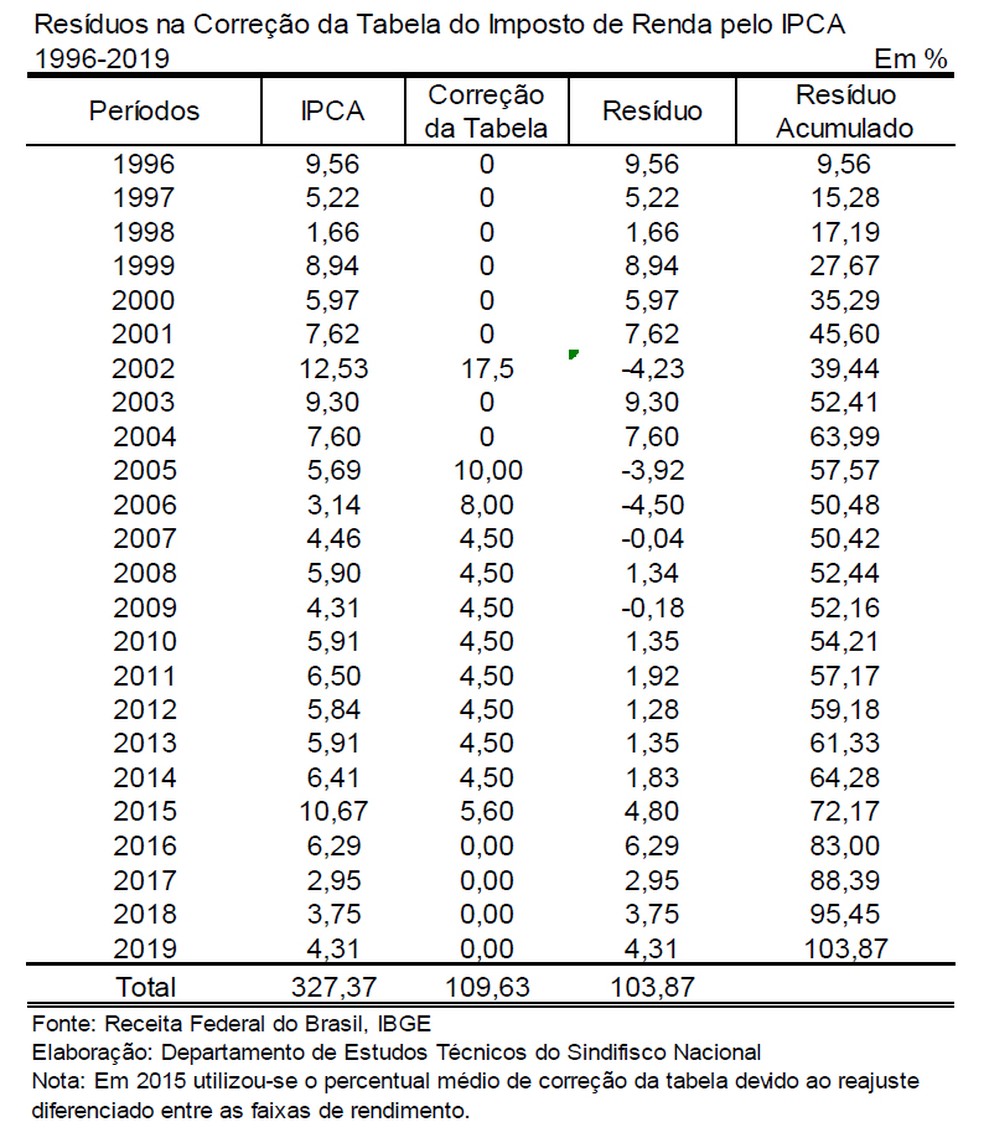 A Unafisco (Associação Nacional dos Auditores Fiscais da Receita Federal), autora do levantamento, calcula ser necessário promover uma correção da tabela a partir daquele ano.