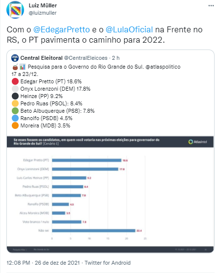 O instituto Atlas apresentou relatório de pesquisa sobre as eleições de 2022 no Rio Grande, realizada entre os dias 17 e 23 de dezembro de 2021, envolvendo 1001 entrevistas feitas online através de convites randomizados e distribuídos por raking algorítmico constituindo uma amostra pelas variáveis de renda, idade e sexo.