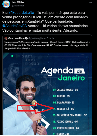 Um tuite de um Card do Gustavo Lima me chamou a atenção pra algo que parece estar passando batido. Shows de Sertanejos e não sertanejos estão acontecendo e acontecerão nos próximos dias, com milhares de pessoas presentes e aglomeradas, no momento em que a Contaminação por COVID-19 bate recordes e chega a números assustadores no Brasil e no mundo.
