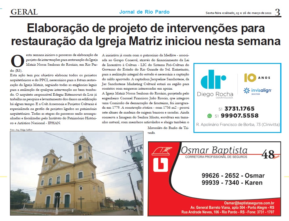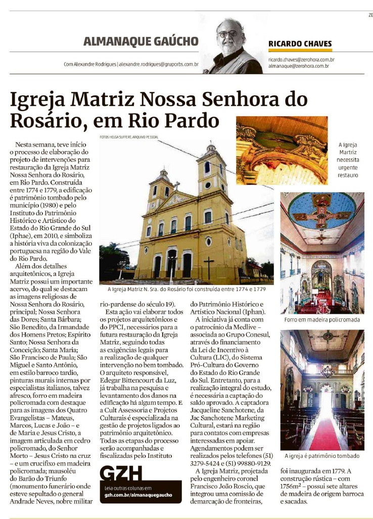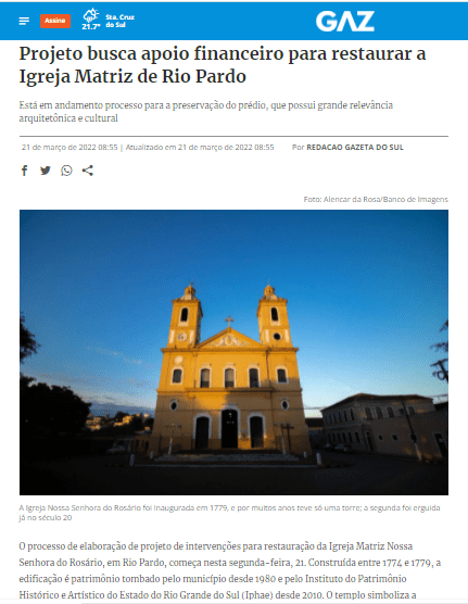 A mobilização da Comunidade pelo Restauro da Igreja Matriz Nossa Senhora do Rosário do Rio Pardo já esta ganhando o olhar da Mídia Local, Regional e também Estadual, já que esta Igreja é Testemunho até mesmo do nascimento do Estado do Rio Grande do Sul.