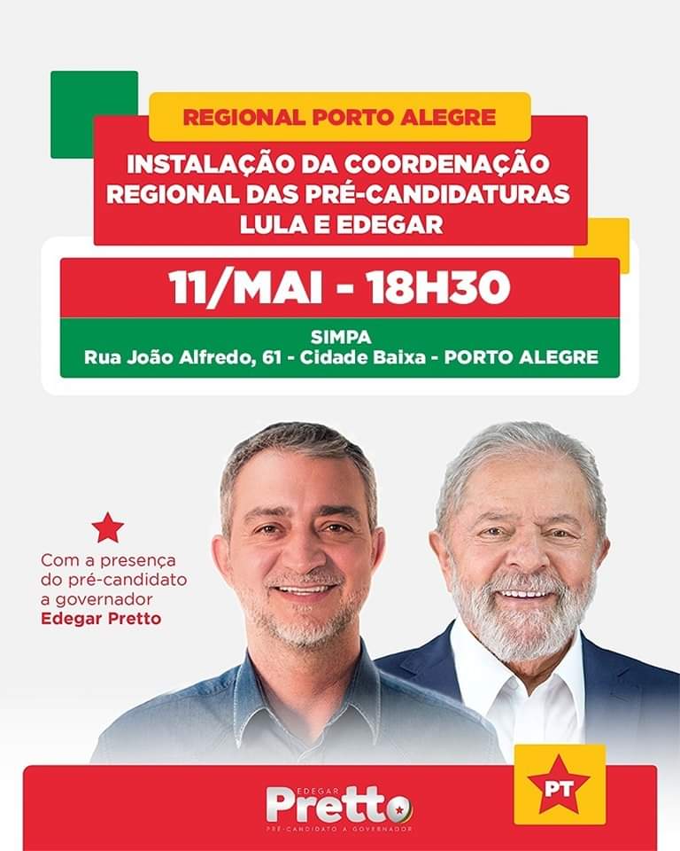 Nesta quarta-feira, 11, às 18h30, será instalada a Coordenação Regional das pré-candidaturas de Lula e Edegar na Regional de Porto Alegre.