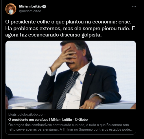 Esta foto o tuite e a manchete do artigo da Miriam Leitão, mensageira dos Marinho, não deixam dúvidas. Ainda mais sabendo-se que a Globo já liberou seus contratados, se quiserem, a integrarem aqueles cordões do “Fora Bolsonaro” e até apoiar Lula explicitamente. Quem conhece a Globo, sabe que isto só é possível por que a Globo liberou.