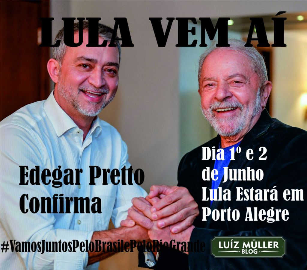 Lula estará no Rio Grande do Sul nos dias 1º e 2 de junho. A informação é do deputado Edegar Pretto, pré-candidato do PT ao governo do Estado. Lula cumprirá agendas em Porto Alegre, conforme já havia sido anunciado dias atrás quando Edegar Pretto e o presidente do PT, deputado Paulo Pimenta, estiveram reunidos com o ex-presidente em Brasília. A partir de agora, a direção do PT gaúcho começa a definir o roteiro que será cumprido nos dois dias de visita