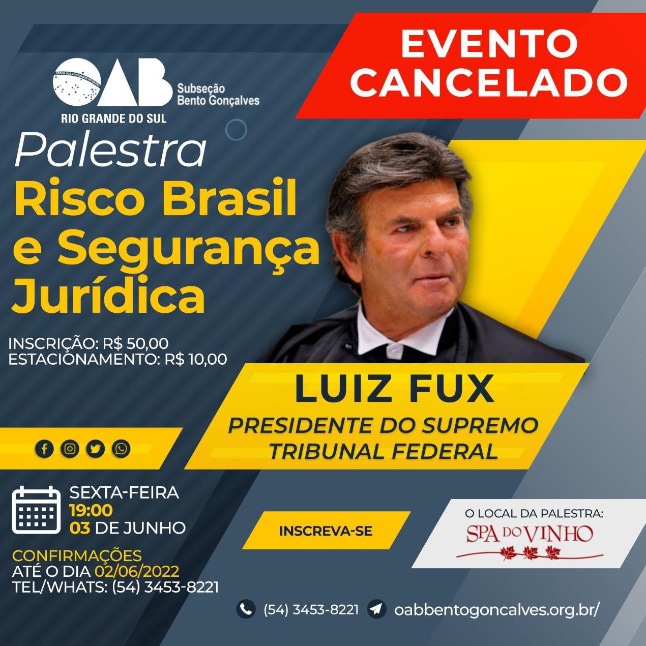 A assessoria do ministro atribuiu o cancelamento da visita à falta de segurança, replicando a justificativa da presidente do CIC, Marijane Paese, ao suspender o jantar e repassar o convidado para a OAB. A decisão, na verdade, foi tomada depois que dois patrocinadores (Sicredi e Saif) se rebelaram e que outros associados criticaram o convite a Fux com a alegação de que a entidade é “apartidária”.