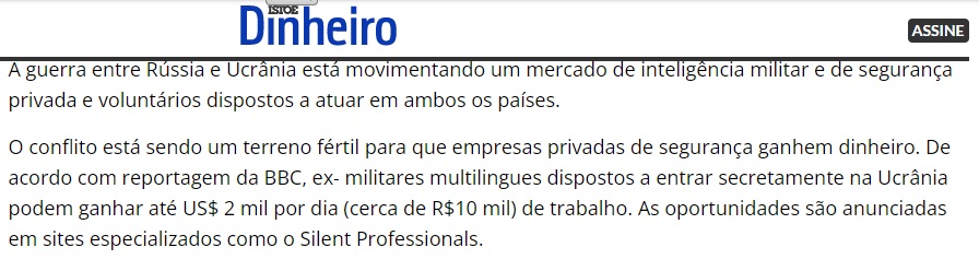 Há ainda matéria bem mais recente, da ISTO É DINHEIRO que fala sobre as “oportunidades do mercado de segurança privado” que s Guerra na Ucrânia oferece. Chamar de “oportunidades de mercado” ganhar dinheiro para matar e morrer numa guerra, mostra o nível de barbárie a que muitos se sujeitam, dispostos a matar por dinheiro. Ou alguém acha mesmo que dá pra ser soldado numa guerra e não matar ninguém? A seguir print de parte da matéria da Isto É dinheiro. Pra íntegra da matéria, basta clicar no print ou link: