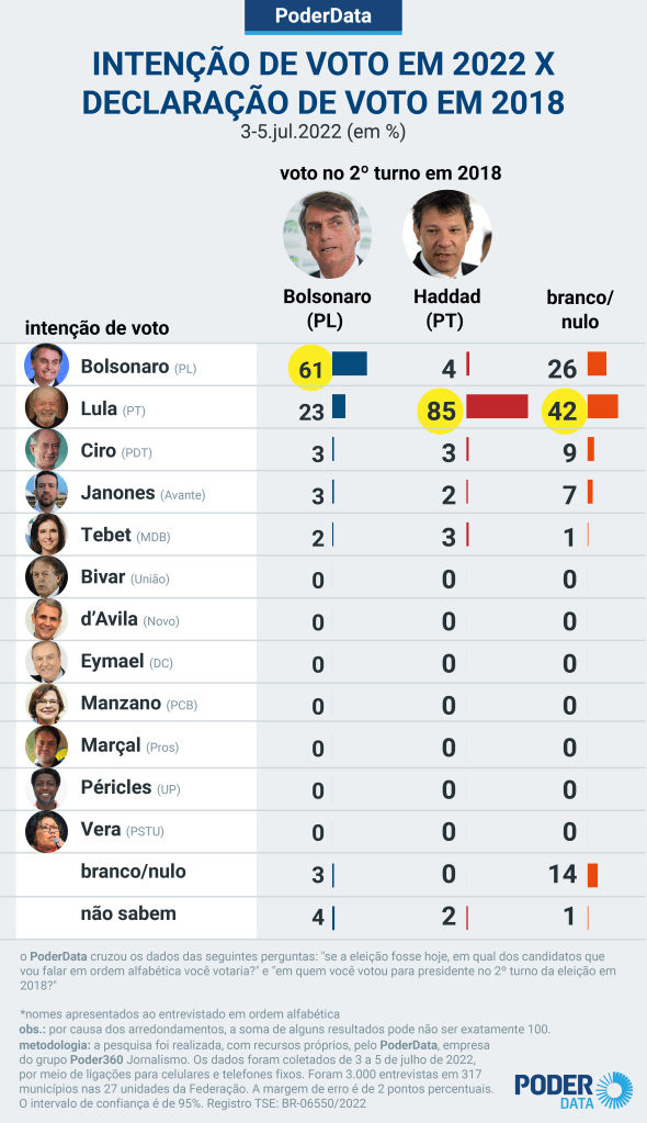 Pesquisa da Poder Data, cruzando as pesquisas recentes com os eleitores de 2018, mostra o que este Blog já demonstrou no artigo Eleitores pobres e jovens da periferia migram de Bolsonaro para Lula, mostra Estudo do CESOP/UNICAMP), publicado em dezembro de 2021.
