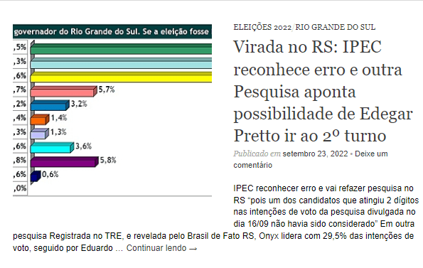 Na semana passada o IPEC cancelou a Pesquisa Para Governador no RS por que detectou crescimento muito forte de Edegar Pretto. No artigo Virada no RS: IPEC reconhece erro e outra Pesquisa aponta possibilidade de Edegar Pretto ir ao 2º turno, reproduzindo pesquisa publicada pelo Jornal Brasil de Fato RS, afirmei a tendência que agora se confirma na Pesquisa corrigida. Edegar Pretto deu um Salto de 5% em apenas uma semana.