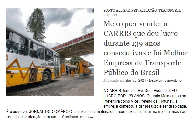 No entanto, a parceria com a ATP não para por aí. Também com o inestimável apoio de uma gang de vereadores ávidos por ter campanhas bem financiadas, Melo esta liquidando A CARRIS, a mais antiga empresa de Transporte Público do Brasil, fundada por Dom Pedro II , que foi por muitos anos premiada como Melhor Empresa de Transporte do Brasil.