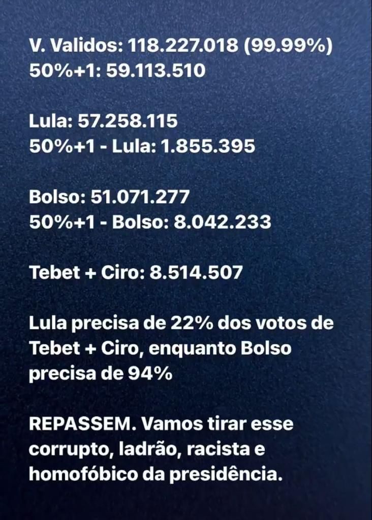 É matemática. Faltam 1.855.395 votos. Se cada um de nós fizer o que eu consegui fazer hoje, de falar pacientemente com um eleitor que não tenha votado no Lula no 1º turno, a vitória virá e o Brasil terá um respiro diante da onda fascista que se fortaleceu no 1º turno.