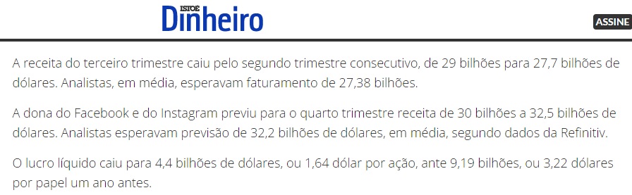 Os Lucros trimestrais da META caíram. Mas mesmo com a queda, foram de 4,4 Bilhões de Dólares. A bagatela de R$ 20 BILHÕES em 3 meses. E o Zuckerberg esta entre os mais ricos do mundo.