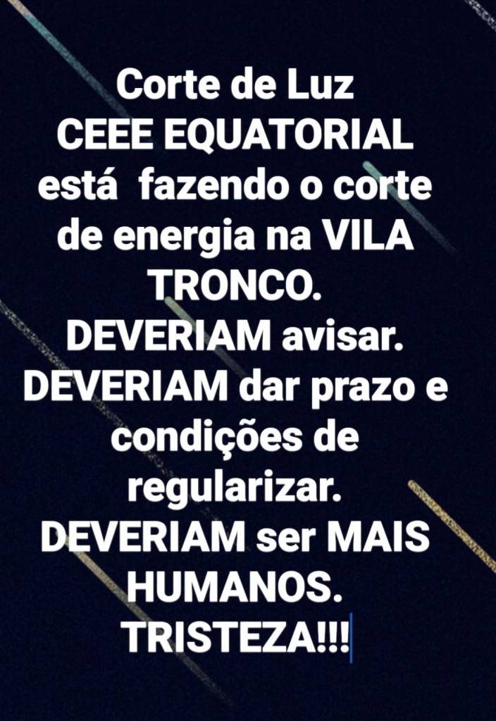 “Pessoas que guardam Remédio da Vida delas na Geladeira”… “Pessoas idosas sem poder fazer nada”…”tem gente que vai chegar em casa de noite e descobrir que tá sem luz”…”alerta as outras comunidades”… são algumas das frases de desespero que podem ser ouvidas no áudio a seguir:
