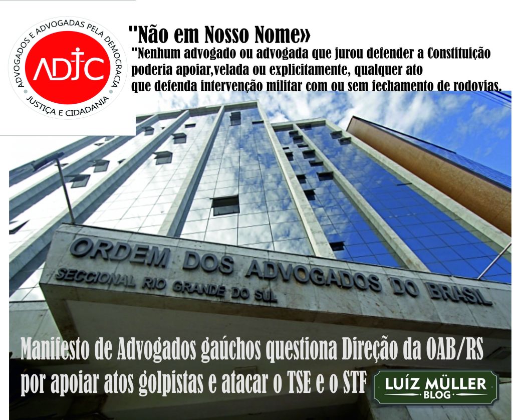 Por tudo isso, a ADJC conclama a todas as demais entidades de advogados e a todas (os) as (os) advogadas (os) democráticas(os) do Rio Grande do Sul para firmarem este documento e cerrarem fileiras diante da gravidade do momento, para que revivamos neste Estado a epopeia de 1961, organizando nova Campanha da Legalidade, resistindo às manobras golpistas que, lamentavelmente, contam, ao menos implicitamente, com o aval de 10(dez) presidentes de Seccionais da OAB – e, como referido, da Presidência da nossa seccional RS – e para garantir a vigência da ordem democrática e a posse do Presidente da República legitimamente eleito.