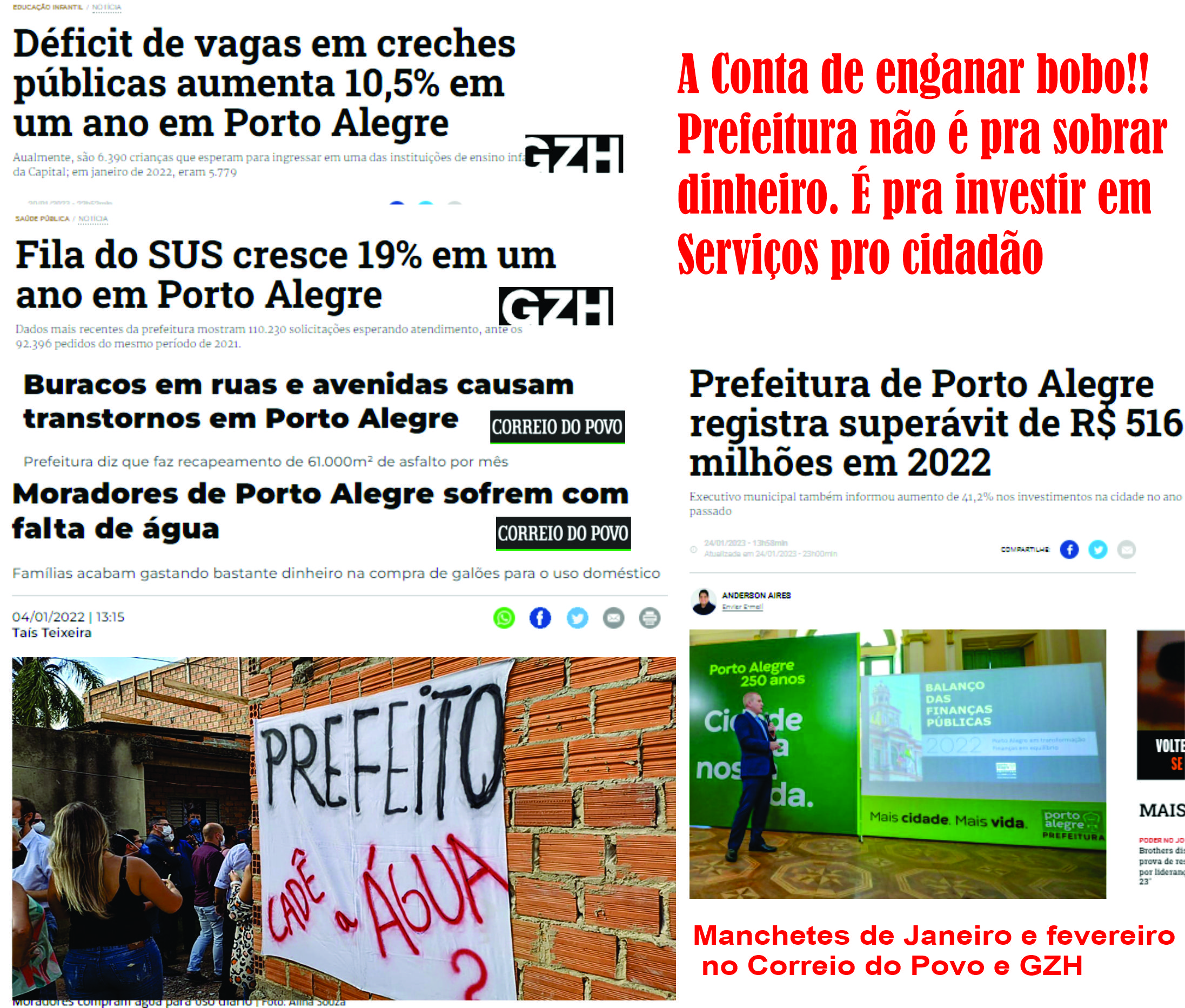 A falta de vagas na educação infantil segue como uma dor de cabeça para a prefeitura e a população de Porto Alegre. Atualmente, há 6.390 crianças de zero a 5 anos na fila de espera por uma creche, ante 5.779 em janeiro de 2022. Ou seja: em um ano, o déficit aumentou em 10,5%. A fila do SUS, com atendimento privatizado só cresce, A falta de água se repete a cada ano, os buracos só aumentam, querem entregar empresas como a Carris e a Procempa, entregam a orla, praças e parques, estão literalmente “vendendo Porto Alegre” e aí se vangloriam de “Sobrar dinheiro no Caixa da Prefeitura”.
