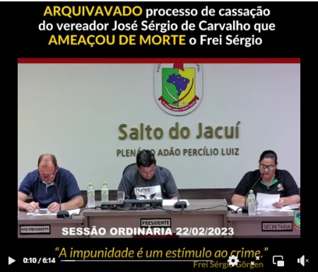 Os vídeo do link do G1 no início deste artigo, mostra claramente as ameaças do Vereador ao Frei Sérgio. É criminoso. E sua impunidade animará bolsonaristas a continuarem suas ações violentas. Por isto é nescessário recorrer judicialmente, como fará a Frei, mas requer também uma ampla divulgação do Crime.