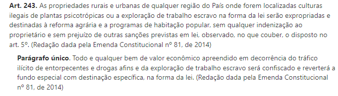 As propriedades rurais e urbanas em que for identificada a exploração de trabalho em condições análogas à escravidão serão expropriadas e destinadas à reforma agrária e a programas de habitação popular, sem qualquer indenização ao proprietário. Este é o segundo artigo do primeiro projeto de lei apresentado pela deputada federal Reginete Bispo (PT-RS), na Câmara Federal.