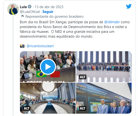 É com grande alegria que retorno a Xangai após quase 20 anos, e por um motivo muito especial. Tenho a satisfação de reencontrar a presidenta Dilma Rousseff e o prazer de comemorar sua escolha para comandar esta importante instituição.