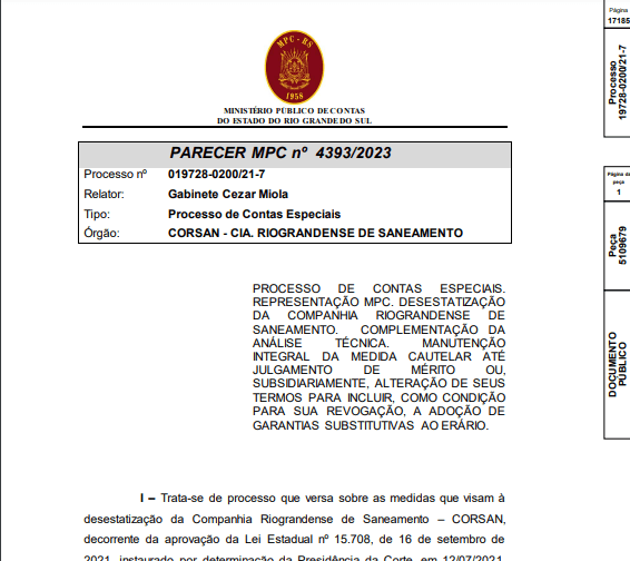 MPC emite parecer em que sugere que seja mantida a liminar e que há muito a ser investigado ainda e confirma o que este blog vem mostrando há muito tempo: O LEILÃO DEVE SER ANULADO E A CPI DA CORSAN É NESCESSARIA .