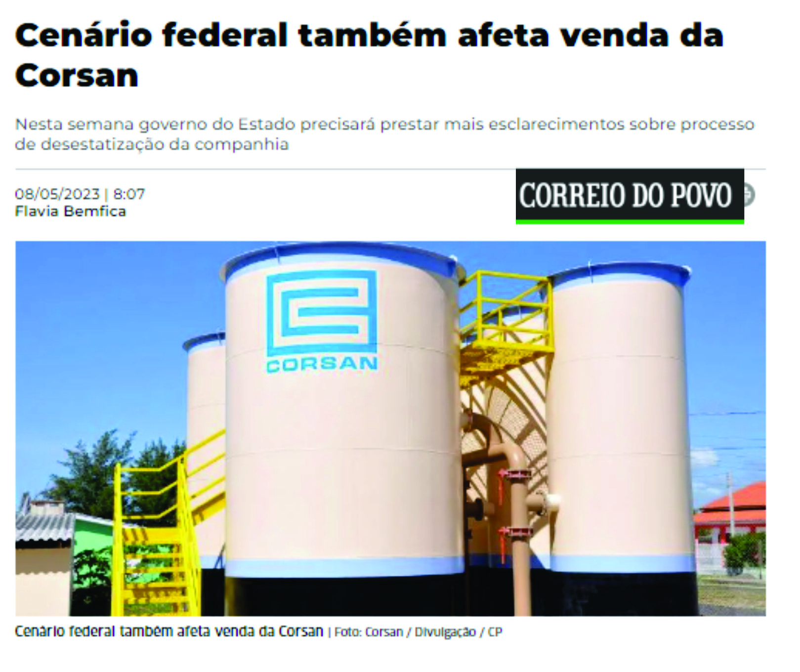 A impossibilidade de fazer os investimentos necessários para alcançar as metas previstas de universalização dos serviços de saneamento foi um dos principais argumentos utilizados pelo governo do Estado para a venda da Corsan. A companhia foi leiloada em dezembro de 2022 e arrematada pela Aegea, líder em saneamento privado no Brasil, por R$ 4,1 bilhões. A empresa foi a única a apresentar proposta no certame.