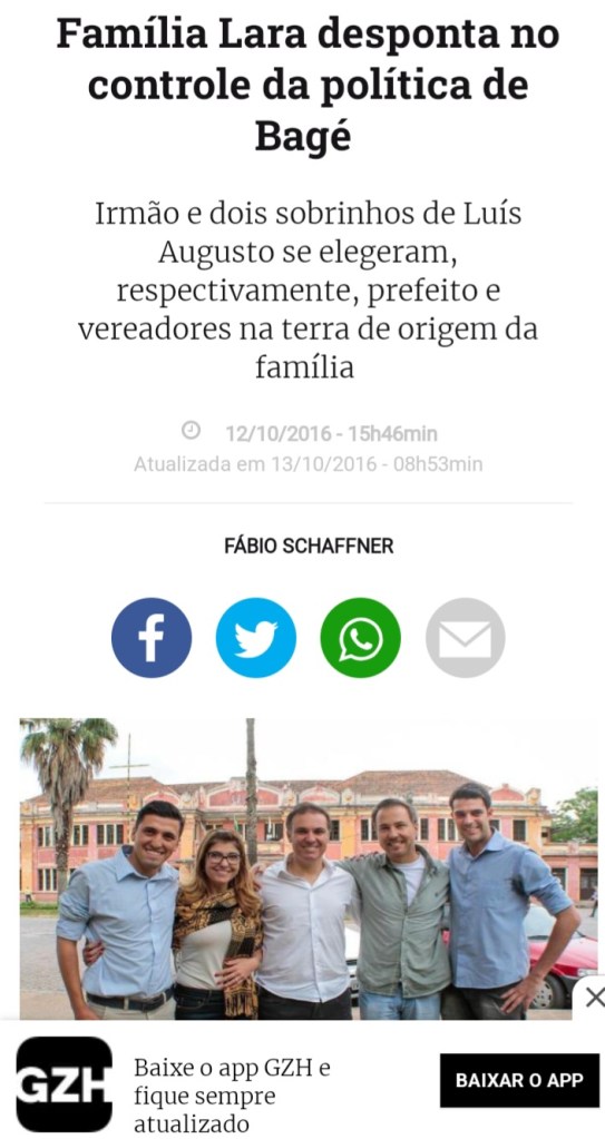 Já quanto a Família Lara, mesmo com baixas, como a cassação do Deputado Luiz Augusto e a Perda de Direitos Politicos do ainda Prefeito de Bagé, Divaldo Lara, parece disposta a expandir sua “dinastia” como chama Zero Hora em matéria, para o Rio Grande inteiro, agora sob as asas do PL de Bolsonaro.