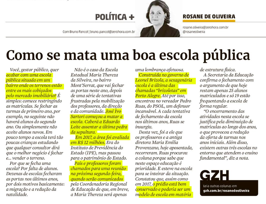 Rosane de Oliveira esta falando só de uma Brizoleta frequentada por filhos da Elite. Por isto resistiu até aqui. Mas não consta que esta mesma Elite e nem a ZH tenham mexido um dedo mindinho ou protestado quando milhares de Brizoletas e Escolas Públicas pelo Rio Grande afora foram sendo fechadas ou sucateadas pelos Governos agora citados por Rosane de Oliveira como Coveiros de Escola Pública.