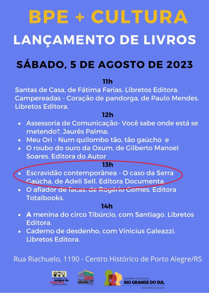 Livro “ESCRAVIDÃO CONTEMPORÂNEA -O CASO DA SERRA GAÚCHA“, esta entre os Livros que serão Lançados na Feira da Biblioteca Pública do Estado neste Sábado, dia 5 de Agosto, as 13 horas.