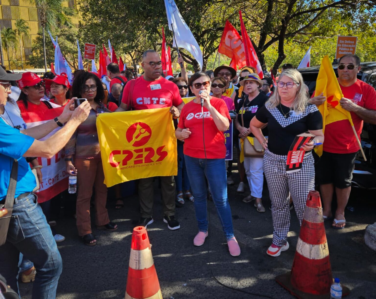 De acordo com a presidente do CPERS, Helenir Schürer, um avanço nas demandas educacionais tem sido observado, mas é preciso reafirmar a posição do Sindicato frente ao Governo Federal. “Esse abraço é para dizer que nós queremos as políticas que nós elegemos ao votarmos no Lula para a Presidência do Brasil. Estamos juntos pela nossa pauta e queremos que o governo venha junto”, argumenta a presidente.