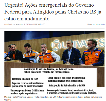 Enquanto o Governador “Conversa” tanto que chega a fazer declarações estapafúrdias, culpando meteorologistas pela sua própria falta de Ação, o Governo Federal esta Presente com tudo que lhe é possível para ajudar a População Gaúcha.