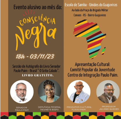 Afim de comemorar e debater as demandas e as lutas do povo negro, é que o gabinete parlamentar do senador Paim no RS realiza, na sexta-feira, dia 3, às 19h evento alusivo ao Mês da Consciência Negra.