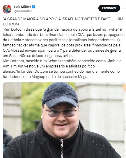 “A GRANDE MAIORIA DO APOIO A ISRAEL NO TWITTER É FAKE” — KIM DOTCOM Kim Dotcom disse que “a grande maioria do apoio a Israel no Twitter é falsa”, lembrando dos bots financiados pela CIA, que fazem propaganda da Ucrânia e atacam vozes pacifistas e jornalistas independentes». O famoso hacker afirma que «agora, os bots pró-Israel financiados pela CIA/Mossad enviam spam para o X para defender os crimes de guerra em Gaza. Não se deixem enganar», avisa. Kim Dotcom, nascido Kim Schmitz também conhecido como Kimble e Kim Tim Jim Vestor, é um empresário e ativista político alemão/finlandês. Dotcom se tornou conhecido mundialmente como fundador do site Megaupload e do sucessor Mega.