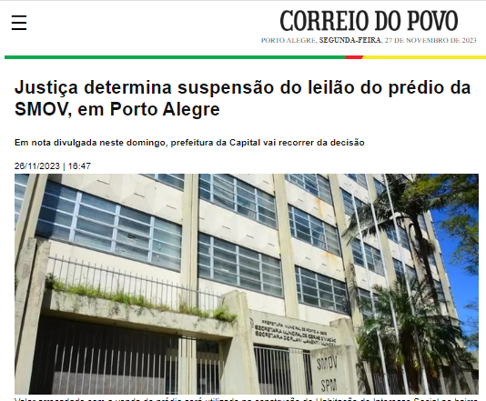 Muitas vezes as entrelinhas de nossa mídia dizem mais do que as linhas que escrevem. Na matéria Justiça determina suspensão de leilão do antigo prédio da Smov , além de mostrar mais um claro episódio da entrega da Cidade aos interesses do poder imobiliário, há também mais um engana povo explícito.