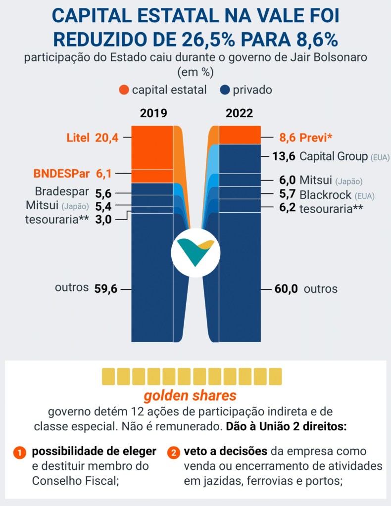 O governo de Jair Bolsonaro (PL) reduziu a participação de empresas e fundos estatais na composição acionária da Vale. O percentual de ações sob influência da União caiu de 26,5% em 2019 para 8,6% no final de 2022. Seguindo a linha do ministro da economia Paulo Guedes, o governo pulverizou a participação na 2ª maior empresa do país e descentralizou seu poder de decisão com parceiros do mercado.