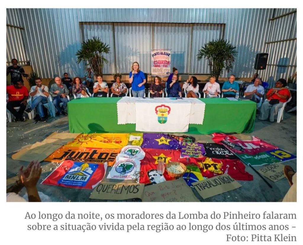 Dia 24 de janeiro de 2024, no mesmo CPCA, 19h, com centenas de participantes: ´PARTIDOS DE ESQUERDA DIALOGAM COM A COMUNIDADE DA LOMBA DO PINHEIRO EM PORTO ALEGRE´ (em Brasil de Fato RS, 25.01.2024): “Representantes dos partidos de esquerda em Porto Alegre realizaram uma Plenária junto à comunidade da Lomba do Pinheiro para escutar demandas da população com o objetivo de unir e coletar informações para a construção de um programa de governo, visando as eleições de 2024.” Presentes, entre outras companheiras e companheiros: Deputada Maria do Rosário, pré-candidata a prefeita pelo PT, deputada Luciana Genro, pré-candidata a prefeita pelo PSOL, Tamyres Filgueira, pré-candidata a vice pelo PSOL, deputada Laura Sito, presidenta do PT POA, vereador Roberto Robaina, presidente do PSOL POA.