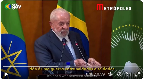 Ações de Israel contra palestinos não têm precedentes, a não ser nas ações de Hitler contra os judeus, diz Lula: “O que está acontecendo na Faixa de Gaza não existe em nenhum outro momento histórico, aliás, existiu quando Hitler resolveu matar os judeus”, declarou o presidente do Brasil, Luiz Inácio Lula da Silva, na capital da Etiópia, Adis Abeba, no âmbito da sua turnê por países africanos. Durante a visita de Lula ao Egito e agora na Etiópia, o tema do conflito em Gaza tem sido um dos principais na agenda. “Quando eu vejo o mundo rico anunciar que está parando de dar contribuição para a questão humanitária aos palestinos, fico imaginando qual é o tamanho da consciência política dessa gente e qual tamanho do coração solidário dessa gente que não está vendo que na Faixa de Gaza não está acontecendo uma guerra, mas um genocídio”, destacou Lula.