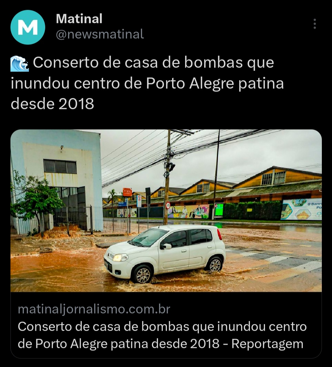Em processo de sucateamento, governo Melo retém R$ 400 milhões no caixa do DmaeFalta de investimento financeiro e em recursos humanos teria relação com a pretensão de privatizar o serviço d’água em Porto Alegre Por Luciano Velleda no SUL 21 A torneira que abre e nada pinga. As ruas inundadas pela maior enchente já vista … Continuar lendo Com R$ 400 milhões na Caixa do DMAE, Melo poderia investir bem na Manutenção do Sistema de Proteção às Cheias…mas não fez ! Continuar lendo →