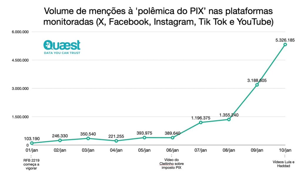 2/ O governo demorou a compreender o que estava acontecendo e entrou atrasado no assunto. E timing é tudo para quem quer pautar debate digital. Foi em setembro que a medida foi anunciada pela Fazenda. O governo teve tempo. Quando o assunto esquentou nas redes com o vídeo do Senador Cleitinho, no dia 06/01, já era tarde. O vídeo teve 3,4 milhões de visualizações e foi o gatilho para a narrativa da oposição. A partir dali o assunto ferveu e chegou no dia 10/01 a produzir mais de 5 milhões de menções sobre o assunto. Foi quando o governo foi lidar com o assunto, de forma protocolar.