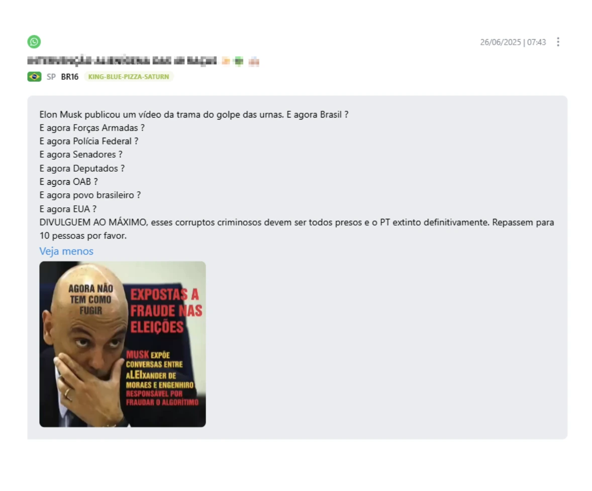 Com o uso da ferramenta Palver — que monitora de forma anonimizada o conteúdo de mais de 100 mil grupos públicos de WhatsApp no Brasil, acessando cada um deles individualmente — o Observatório Lupa analisou 244 mil mensagens publicadas no aplicativo, em português, entre 1º de julho de 2024 e 1º de julho de 2025. Todas foram marcadas pela Meta com a etiqueta “encaminhada com frequência”. O acervo inclui textos, áudios, imagens e vídeos que circularam em 125 mil grupos públicos do WhatsApp.