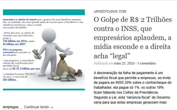 E o que querem os empresários? Jogar o ônus nas costas dos trabalhadores que seguem contratados como CLT. O Foco deles é tentar obrigar o Governo a não mais reajustar os Salários dos atuais aposentados por … 6 anos. Mas este valor pouco significa diante dos R$ 2 TRILHÕES de perdas por Pejotização, Desoneração e sonegações dos empresários.